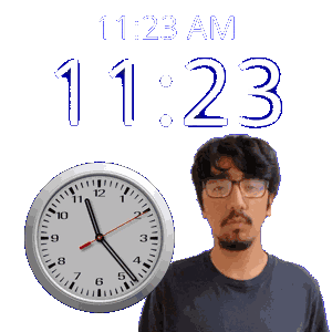 a man with glasses stands next to a clock that says 11:23 am