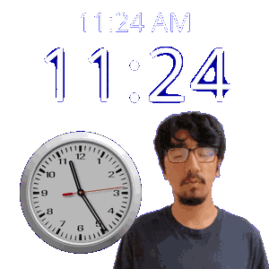 a man wearing glasses stands in front of a clock that says 11:24 am