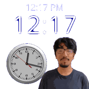 a man with glasses stands in front of a clock that says 12:17