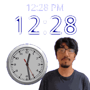a man wearing glasses stands in front of a clock that says 12:28 pm