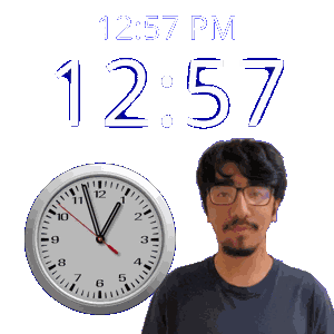 a man with glasses stands in front of a clock that reads 12:57 pm