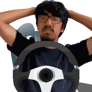 a man with glasses is sitting in a chair with a steering wheel behind him