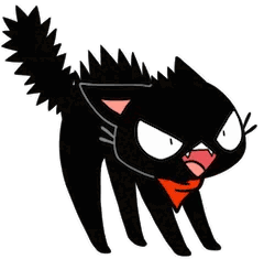 An animated sticker of an angry black cartoon cat with an arched back, bristling fur, and an open mouth, appearing to hiss.