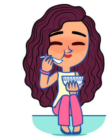 A cute cartoon girl with curly hair happily enjoys a meal from a bowl with a spoon, showing her delight.