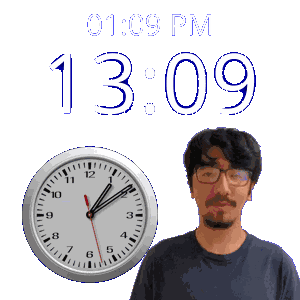 a man wearing glasses stands in front of a clock that says 1:09 pm