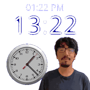 a man with glasses stands next to a clock that says 12:22 pm