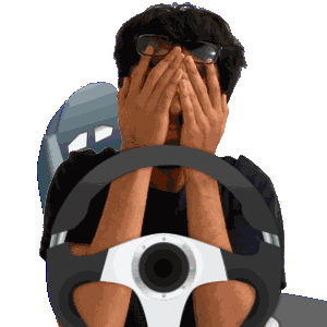 a man covering his face with his hands while sitting behind a steering wheel