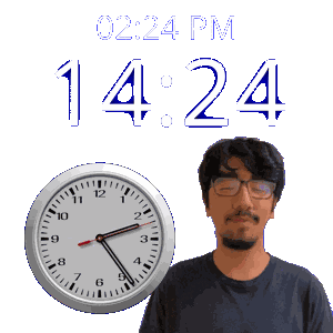 a man with glasses stands in front of a clock that says 14:24