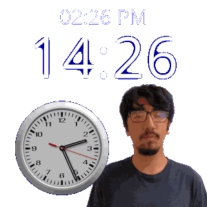 a man with glasses stands in front of a clock that says 14:26 pm