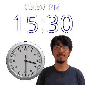 a man standing next to a clock that says 1530