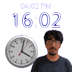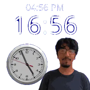 a man with glasses stands next to a clock that says 16:02
