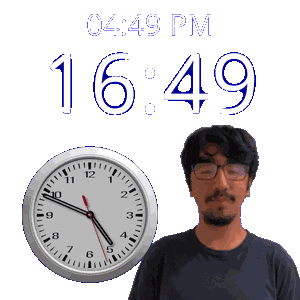 a man with glasses stands in front of a clock that reads 16:49 pm