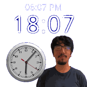 a man with glasses stands next to a clock that says 18:07
