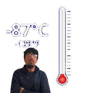 a man with glasses stands next to a thermometer that reads -87 degrees c