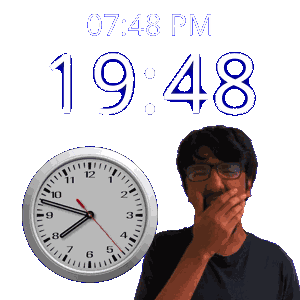 a man is covering his mouth in front of a clock that says 19:48 pm