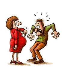 A woman pranks a man by pretending to be pregnant, then reveals it's an April Fools joke with a pillow.