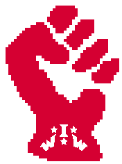 A pixelated red raised fist, the iconic symbol of the Industrial Workers of the World (IWW), representing labor solidarity and revolution.