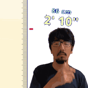 a man wearing glasses stands in front of a ruler that reads 86 cm 2 ' 10 '