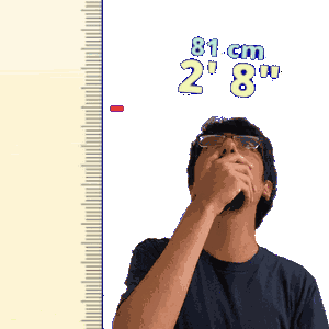 a man with glasses covering his mouth in front of a ruler that reads 81 cm 2 ' 8 '