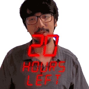 a man wearing glasses stands in front of a sign that reads 20 hours left