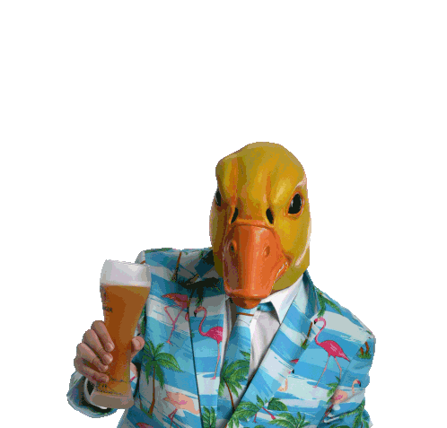 A person in a duck mask and flamingo suit toasts with beer, wishing 'HAPPY NEW' for Silvester 2020.