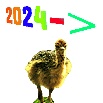A cute and funny baby ostrich stands with a '2024->' sign, perfect for new year greetings and playful messages.