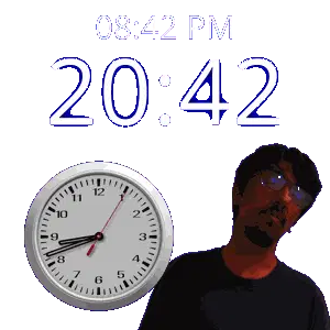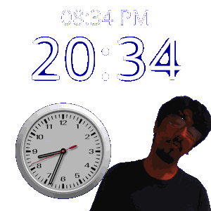 a man is standing next to a clock that says 2034