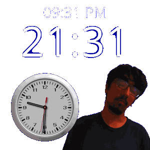 a man stands in front of a clock that reads 21:31 pm