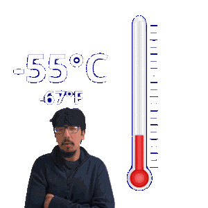 a man stands next to a thermometer that says -55 degrees