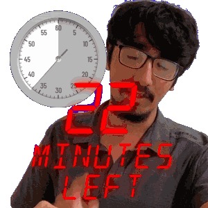a man with glasses and a clock behind him that says " 2 minutes left "