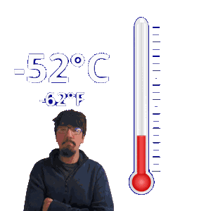 a man with glasses stands next to a thermometer that reads 52 degrees