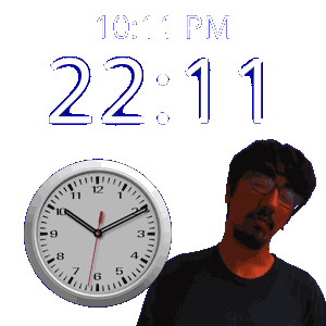 a man is standing in front of a clock that says 10:11 pm