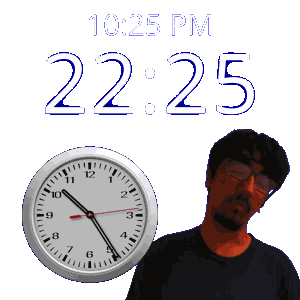 a man with glasses stands in front of a clock that says 10:25 pm