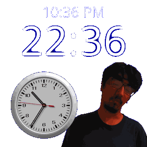 a man stands in front of a clock that reads 22:36 pm