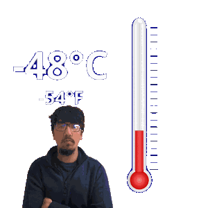 a man stands in front of a thermometer that reads 48 degrees c