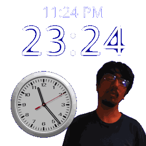 a man stands in front of a clock that says 11:24 pm