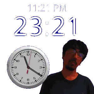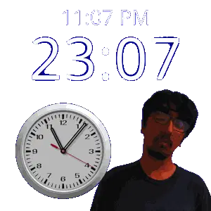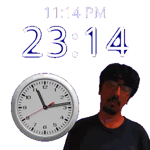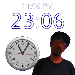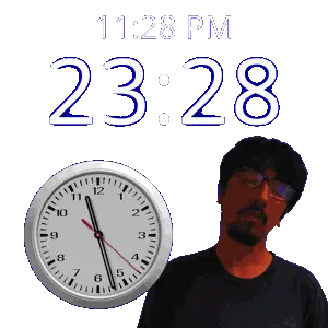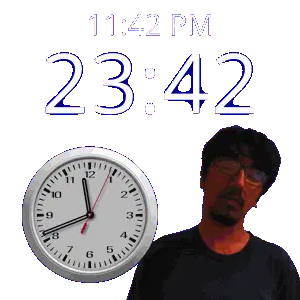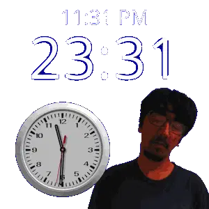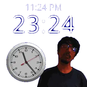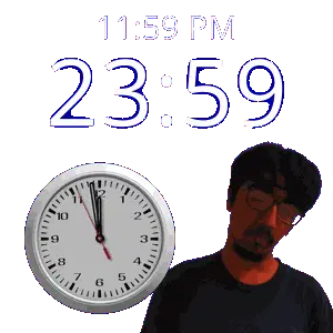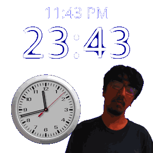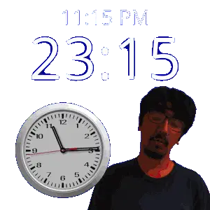 a man stands in front of a wall clock that says 11:43 pm