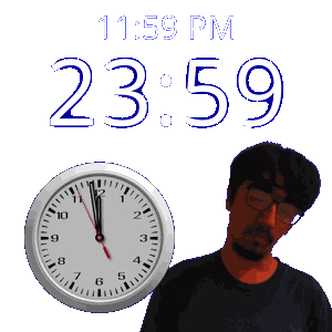 a man is standing next to a clock that says 11:59 pm
