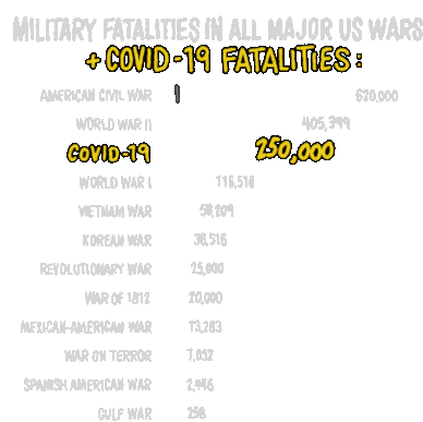 A bar chart comparing 250,000 COVID-19 fatalities in the US to military deaths in major American wars, highlighting the pandemic's impact.
