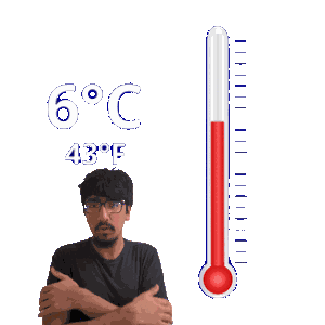 a man is standing next to a thermometer that reads 6 degrees