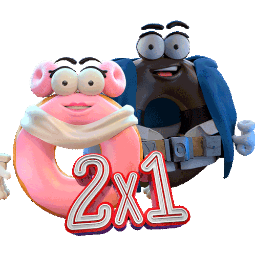 Mr D and his pink donut partner celebrate love with a 2x1 offer, surrounded by hearts and romance.