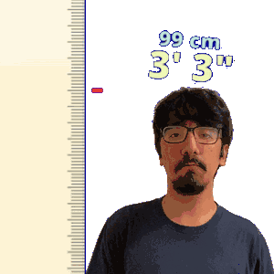a man with glasses is measuring his height with a ruler that says 99 cm 3 ' 3 "