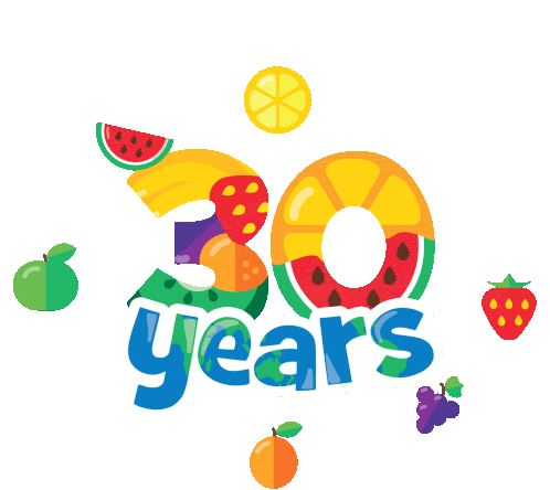 Animated sticker celebrating The Wiggles' 30th anniversary, featuring colorful fruits like watermelon, lemon, and strawberry.