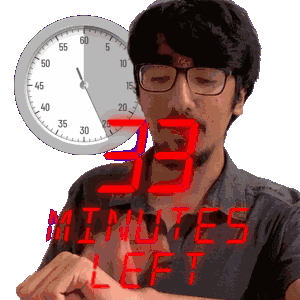a man with glasses and a clock behind him that says 33 minutes left on it