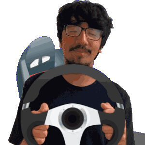 a man with glasses is holding a steering wheel in his hands