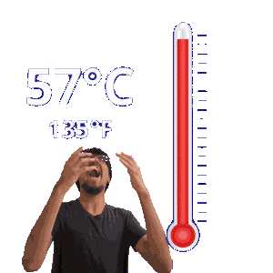 a man screams in front of a thermometer that reads 57 degrees celsius