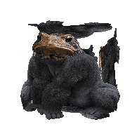 A funny 3D animated gorilla frog creature with a brown head and dark body, spinning with an object above its head.