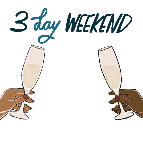 Two diverse hands toast with champagne glasses, celebrating a 3-day weekend with a chill vibe.