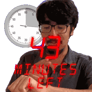 a man wearing glasses is looking at his watch with the words " minutes left " written in red