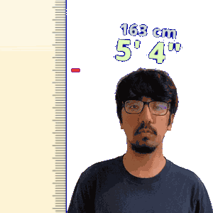 a man with glasses and a ruler that says 163 cm 5 ' 4 "